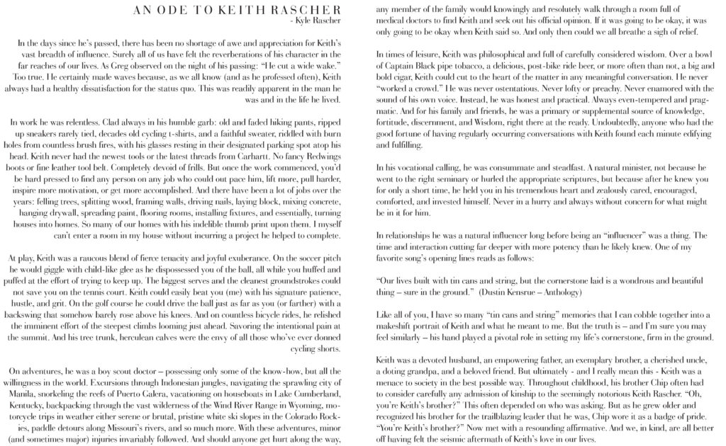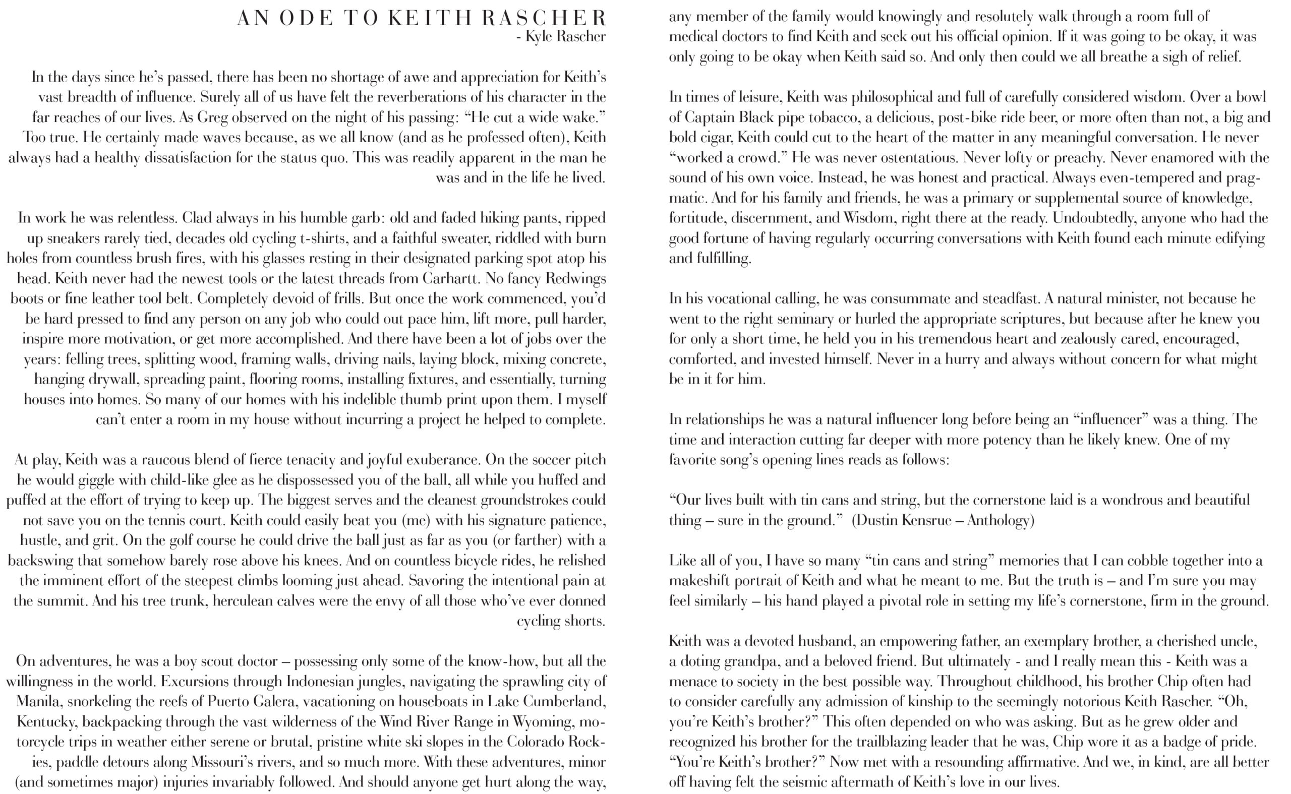 Please find the link to the Keith Rascher’s Celebration of Life service here: https://youtu.be/O2kFSLMWun0