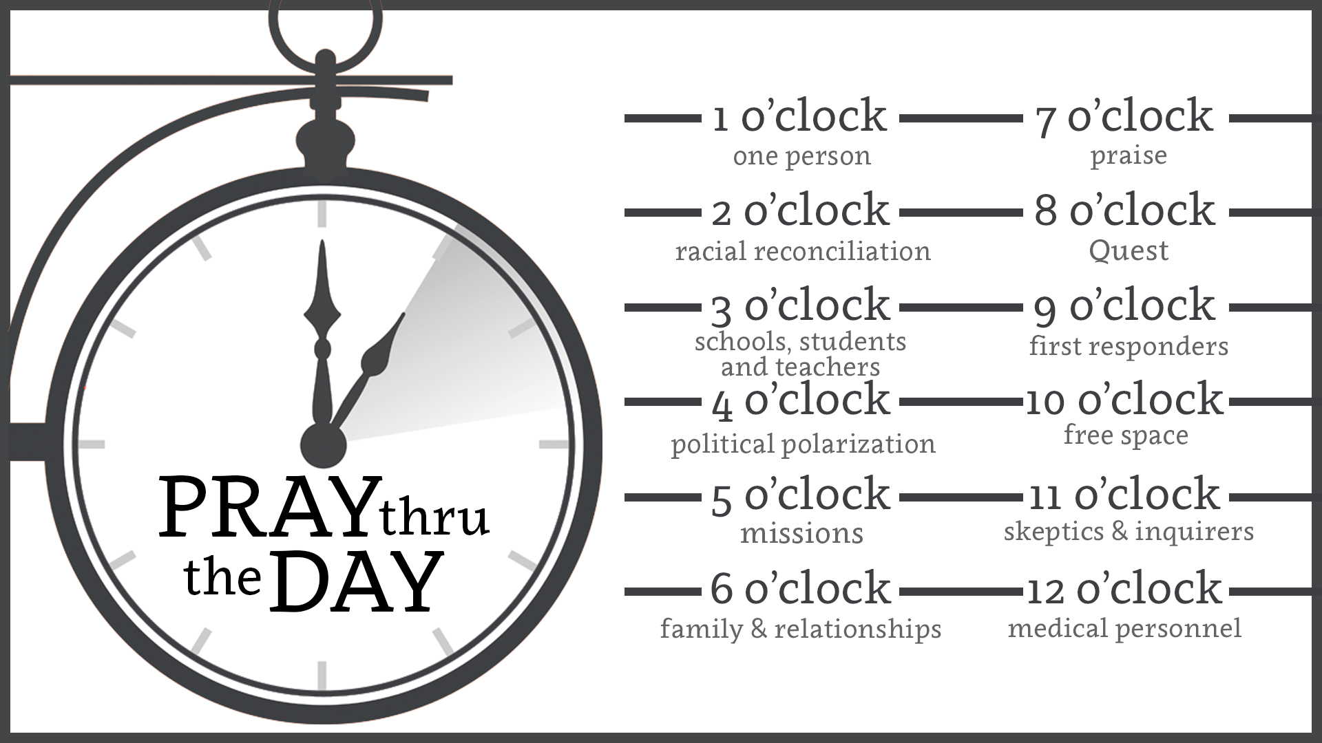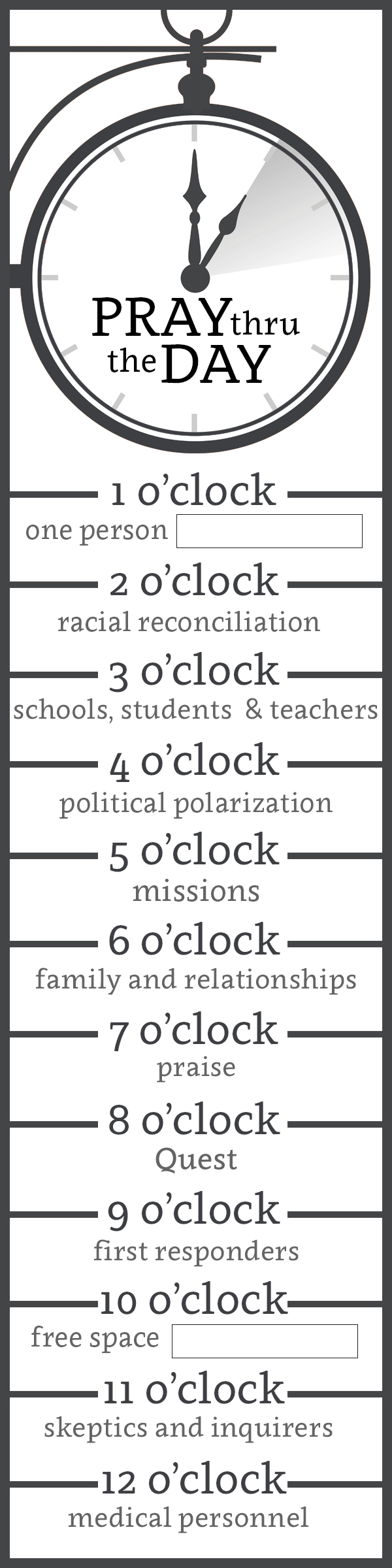 We have bookmarks with each hour’s topic, so feel free to grab one or more of those when you’re at the Quest building on Sunday mornings. You can find those at the ministry table. Whether you want to pray at the top of each hour or at some point in that hour, how you arrange it is up to you. You can set phone alarms or use apps (Echo or Prayminder) that will send you notifications or reminders. We’re not doing this in a legalistic way, so if you miss from time to time, its OK! We just want to set you up to have all the tools you need to help make prayer a habit, and forming new habits takes time.