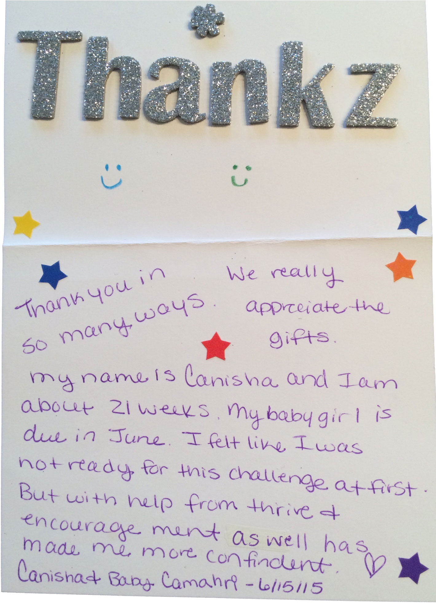 After the donations were delivered, the first Thrive Mother that got to shop at the store wrote Quest a thank you note. We thought you’d like to read it.