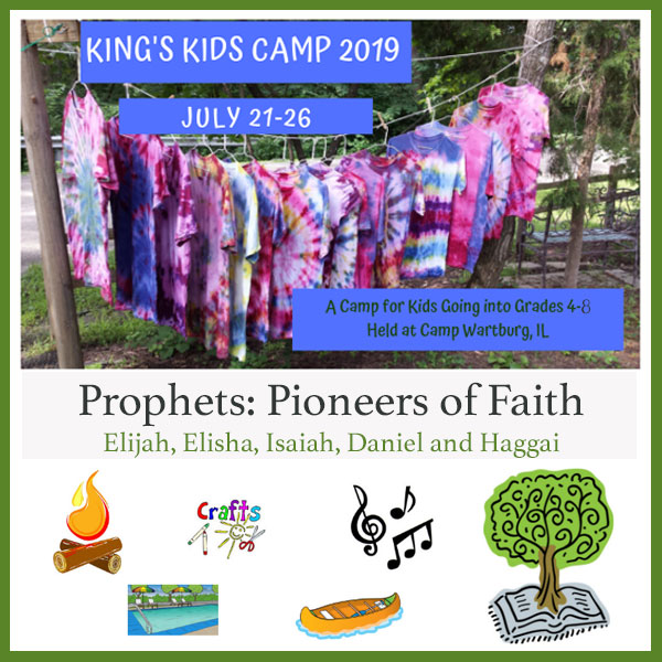 King’s Kids Camp is a camp held at Camp Wartburg, IL. It’s a ministry of the St. Louis area Evangelical Free Churches. This year’s theme is Prophets: Pioneers of Faith (with a specific focus on Elijah, Elisha, Isaiah, Daniel and Haggai). There is lots to do at camp with activities ranging from sports, to crafts, to swimming, music and of course, studying God’s word.