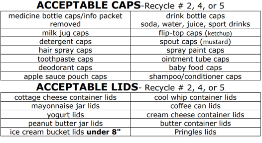 Please see the list below of the caps and lids that are accepted.  If you bring your cap and lids into Quest, please put them in a bag of some kind. We’ll have a place to put them next to the Ministry Table on Sunday mornings.